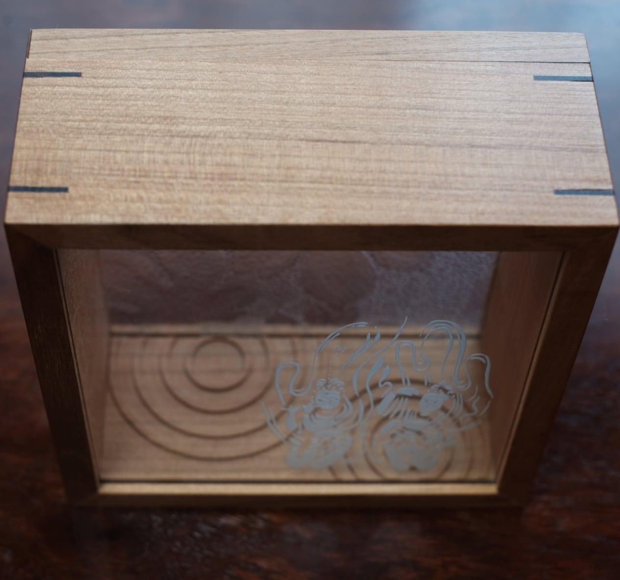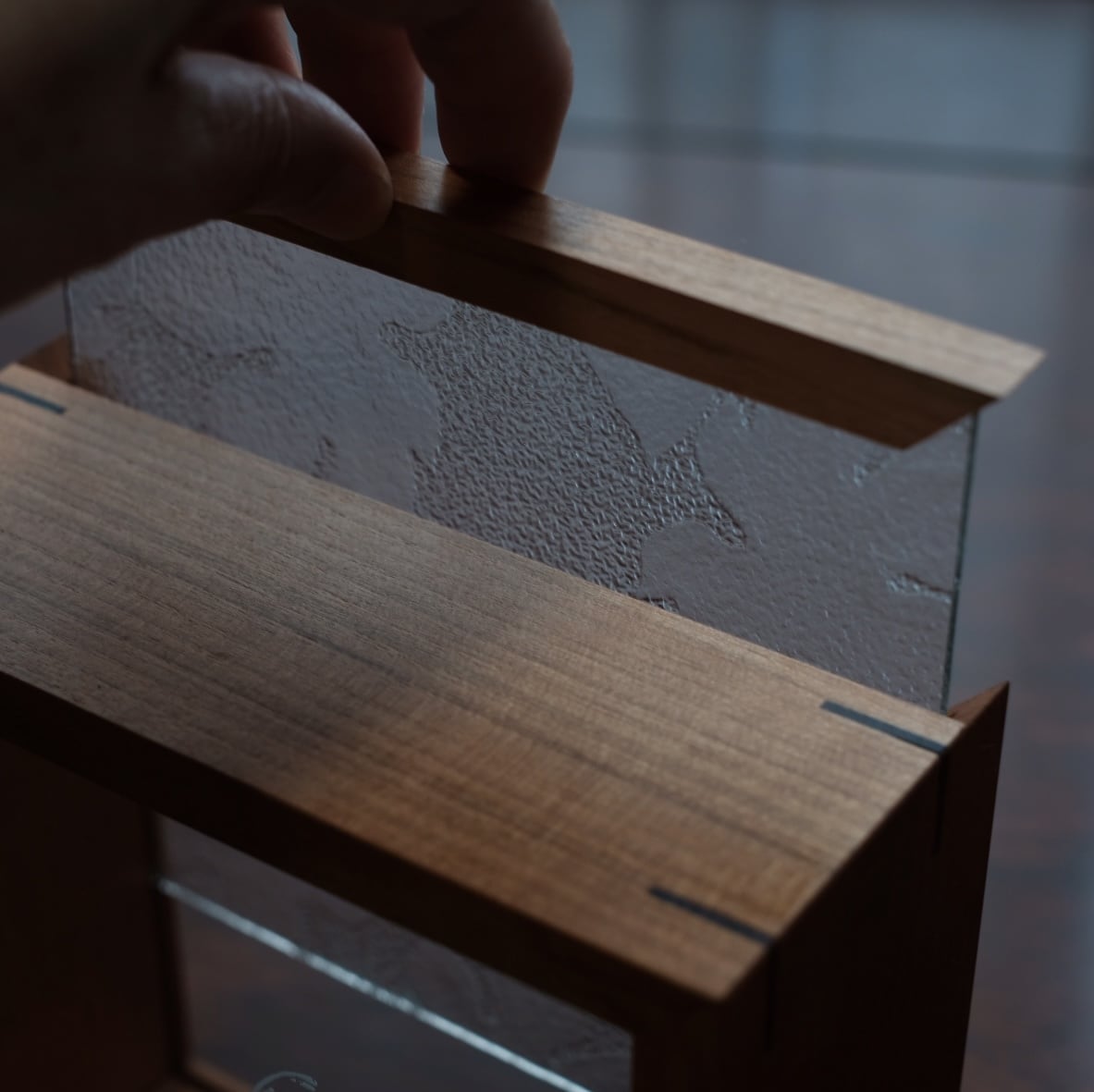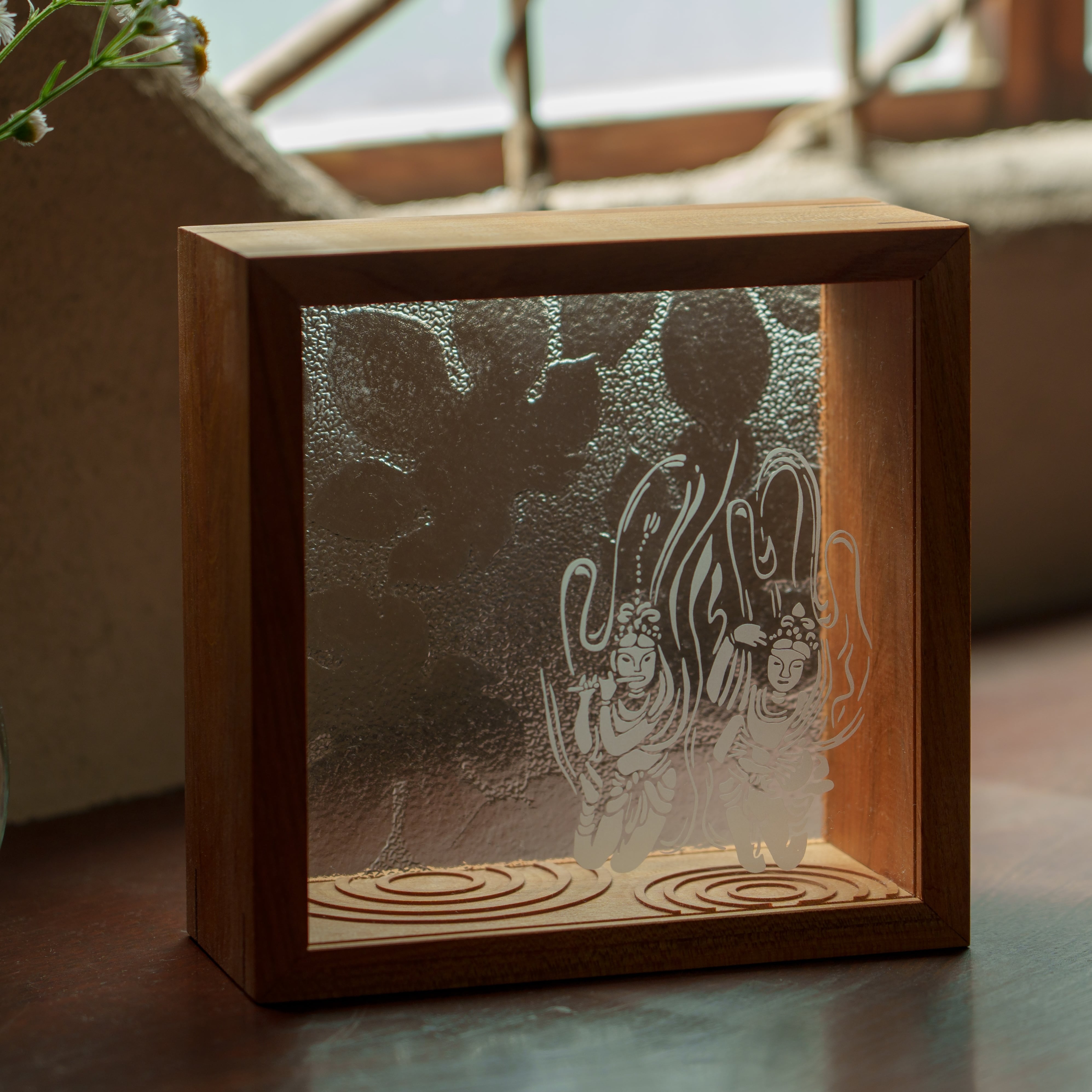 島根県安来市の名刹 雲樹寺に残されていた昭和型板ガラス「ときわ」。このガラスを背面に置き、手前には開山堂に収められた1300年もの歴史を持つ鐘に刻まれた奏楽天女、目に見えぬ真の幸福を音に乗せ心のうちに運ぶ存在。この天女を透明のガラスに刻み、ときわガラスと共に重ね見る「雲樹寺の窓」が生まれました。そこの部分には庭の砂紋が彫刻されています。ときわガラスと天女に守られた小さな空間には大切なものをそっと入れておくことが出来ます。
