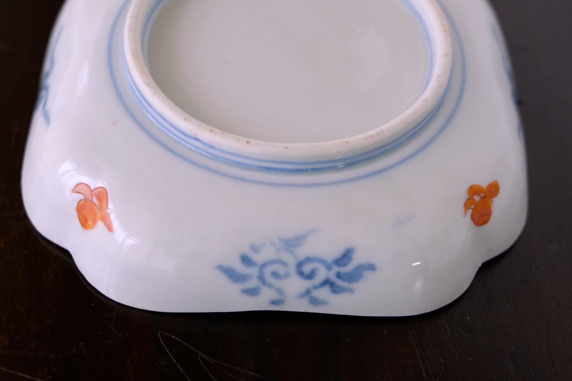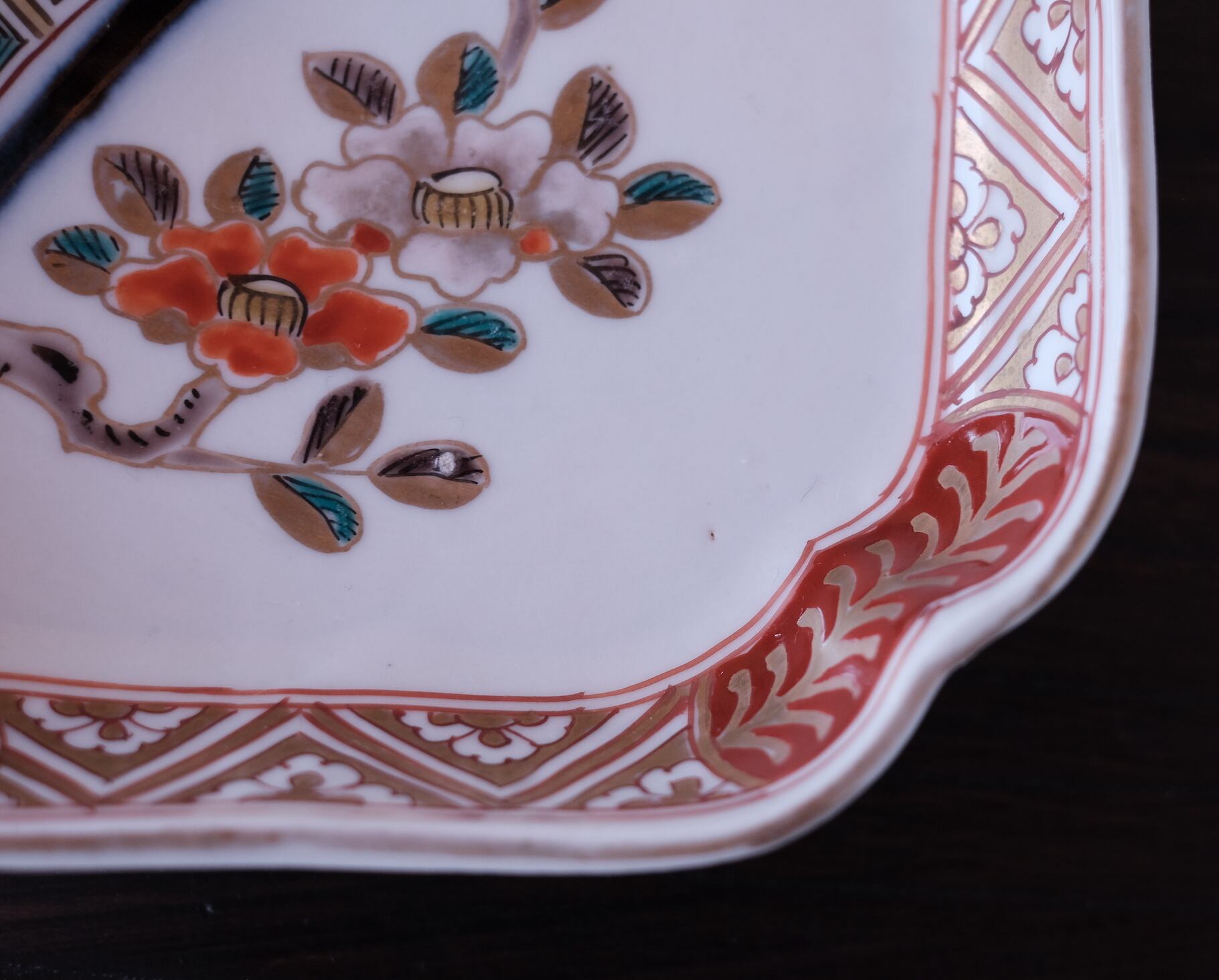 大胆な構図で、伝統柄が手慣れたタッチで描かれた華やかな四方隅入り角皿です。緻密な柄でありながらちょっと気の抜けたような空気感が楽しい一皿です。