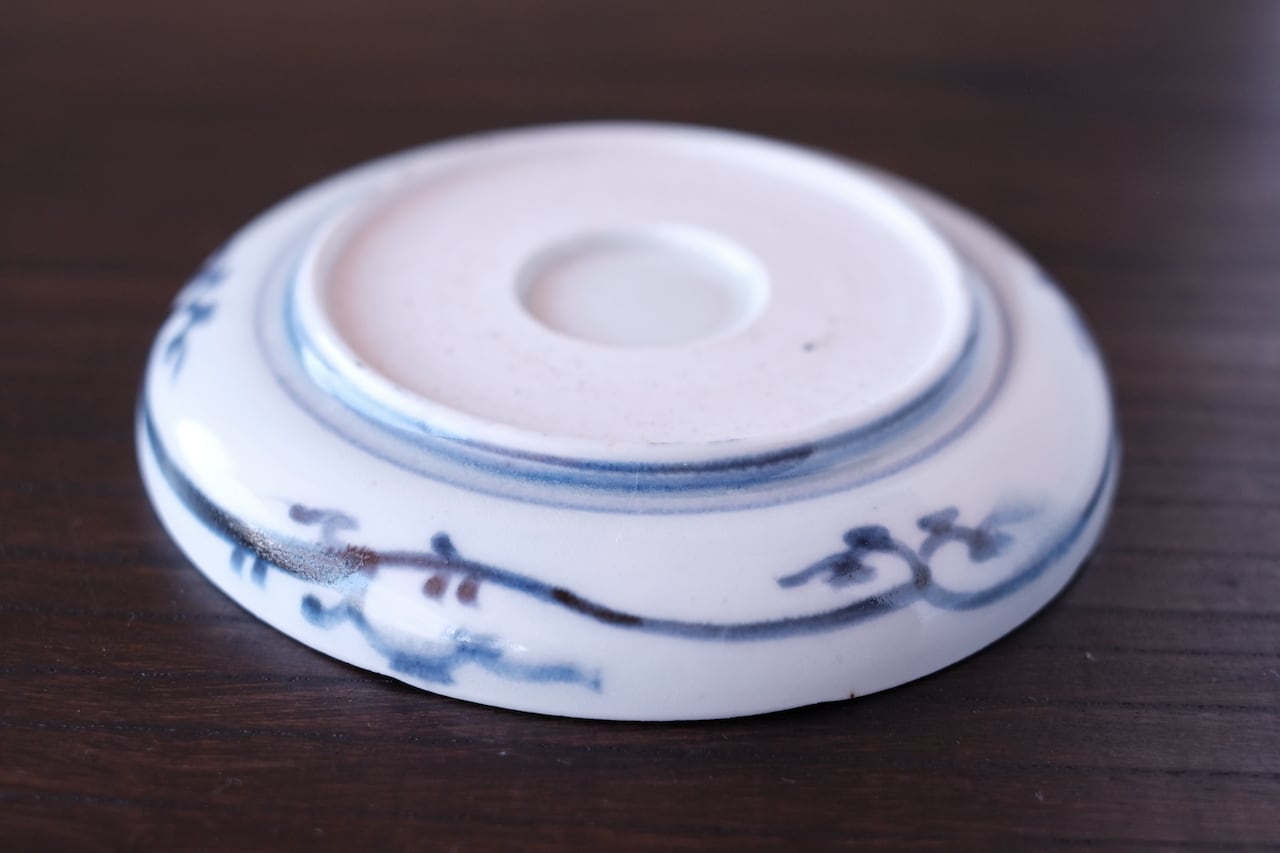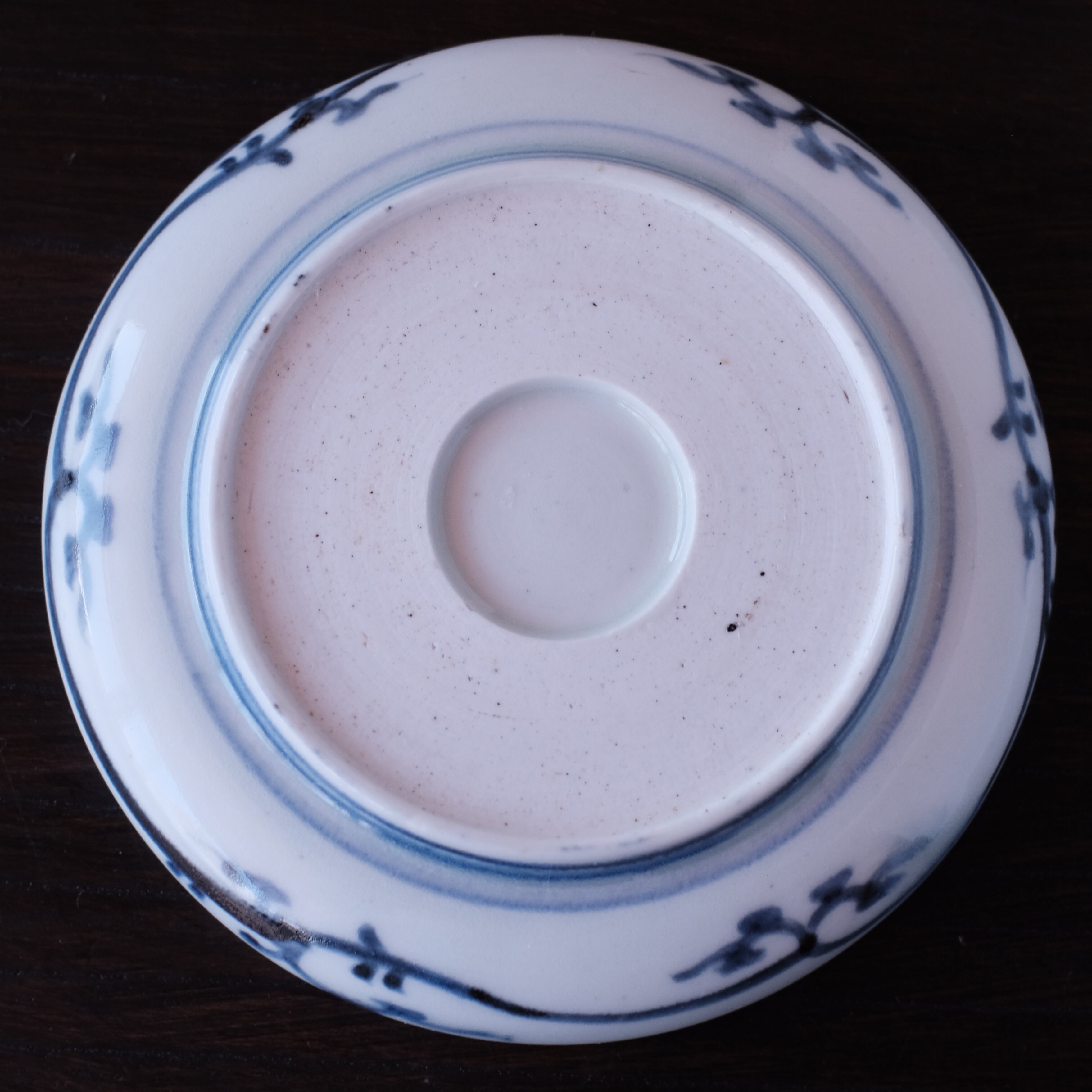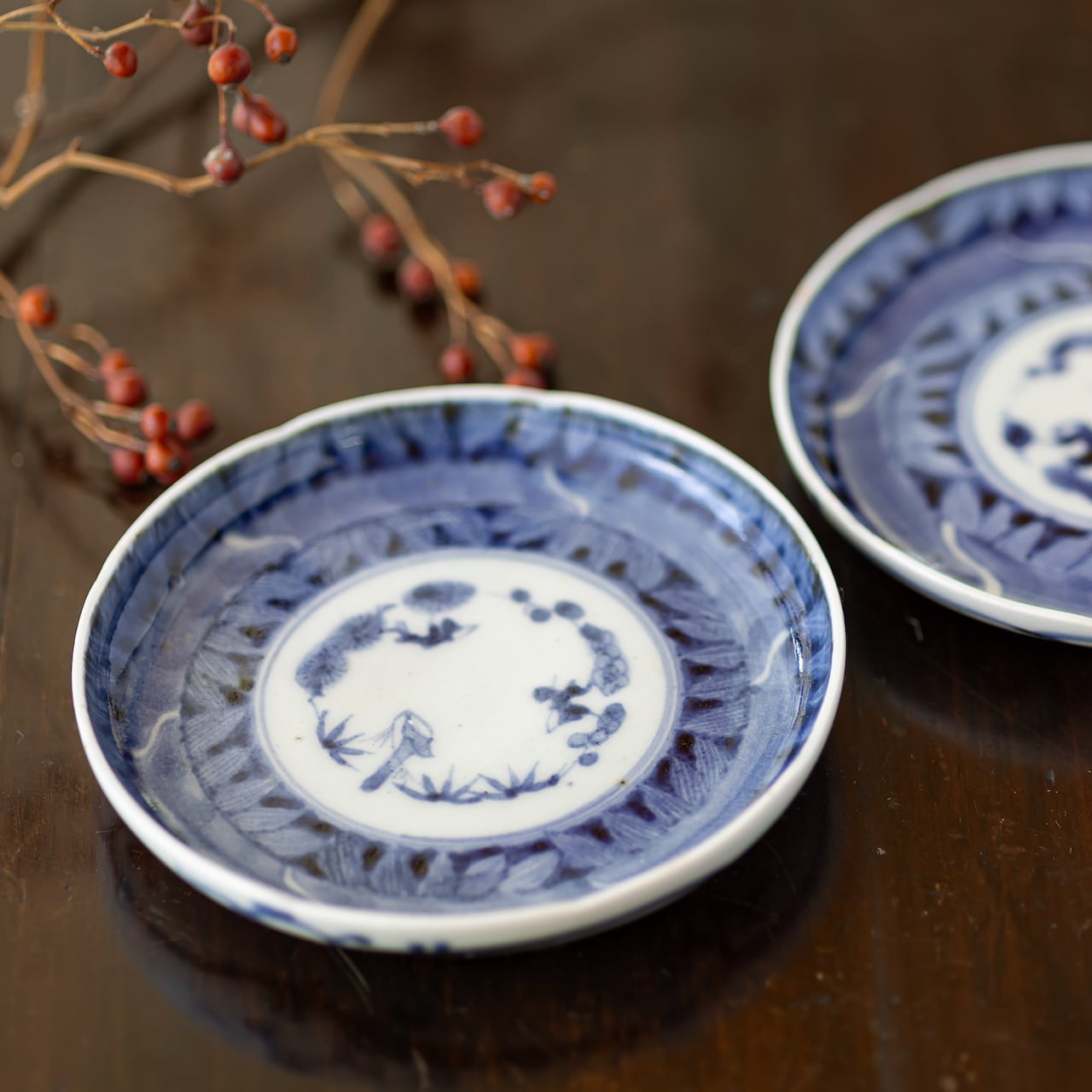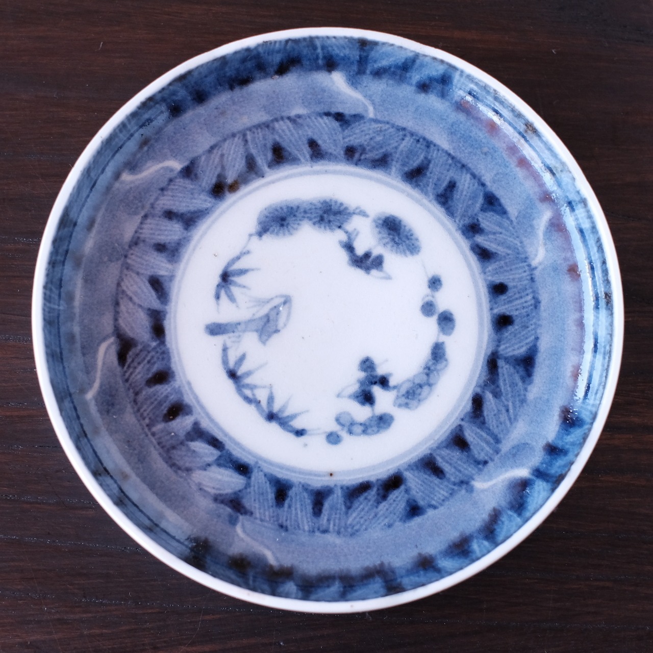 白地に松竹梅を配した見込みの周囲には、笹の葉がぐるりと描かれた優しい風合いの伊万里小皿。江戸後期でしょうか。小さなケーキやタルトをのせたくなる大きさです。ちょっとした取り皿にも使いやすそうです。