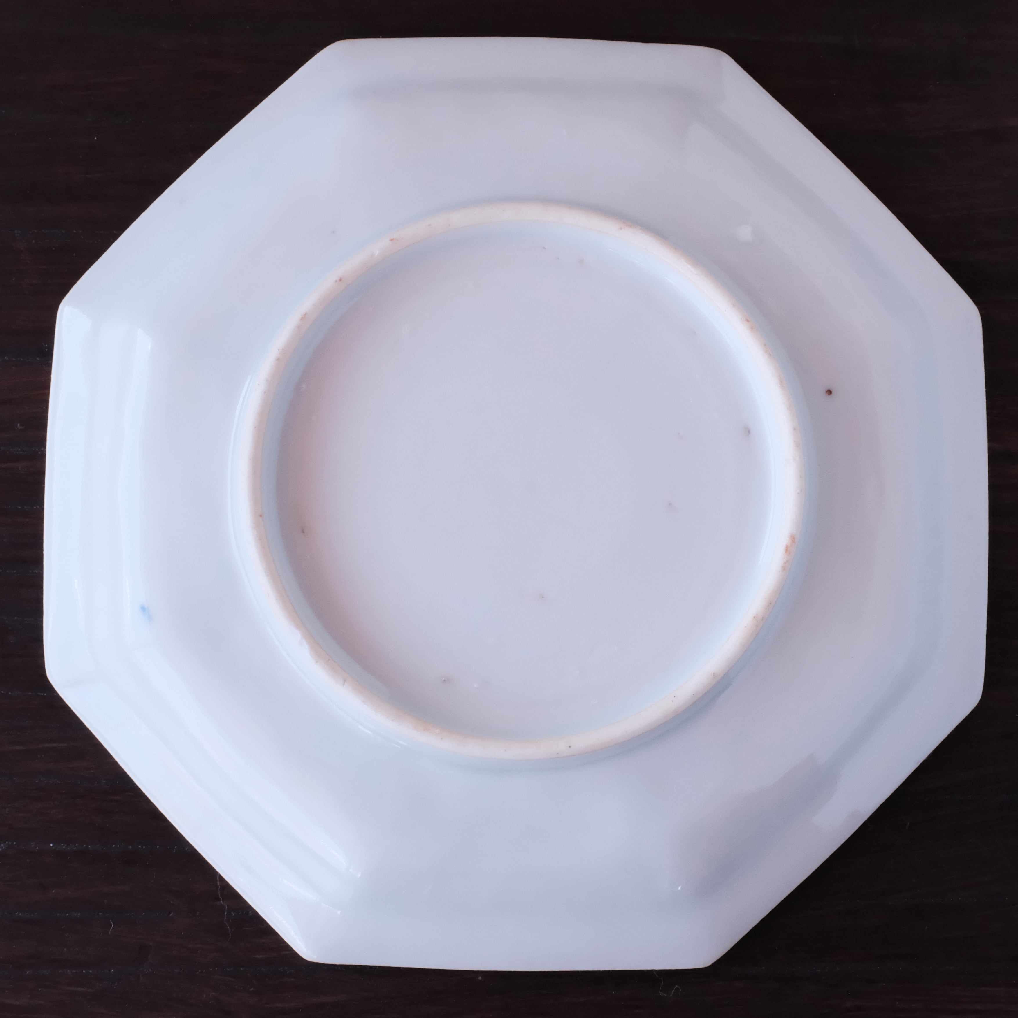 すっきりとした白地に藍色の牡丹の花、美しくシャープな八角皿です。