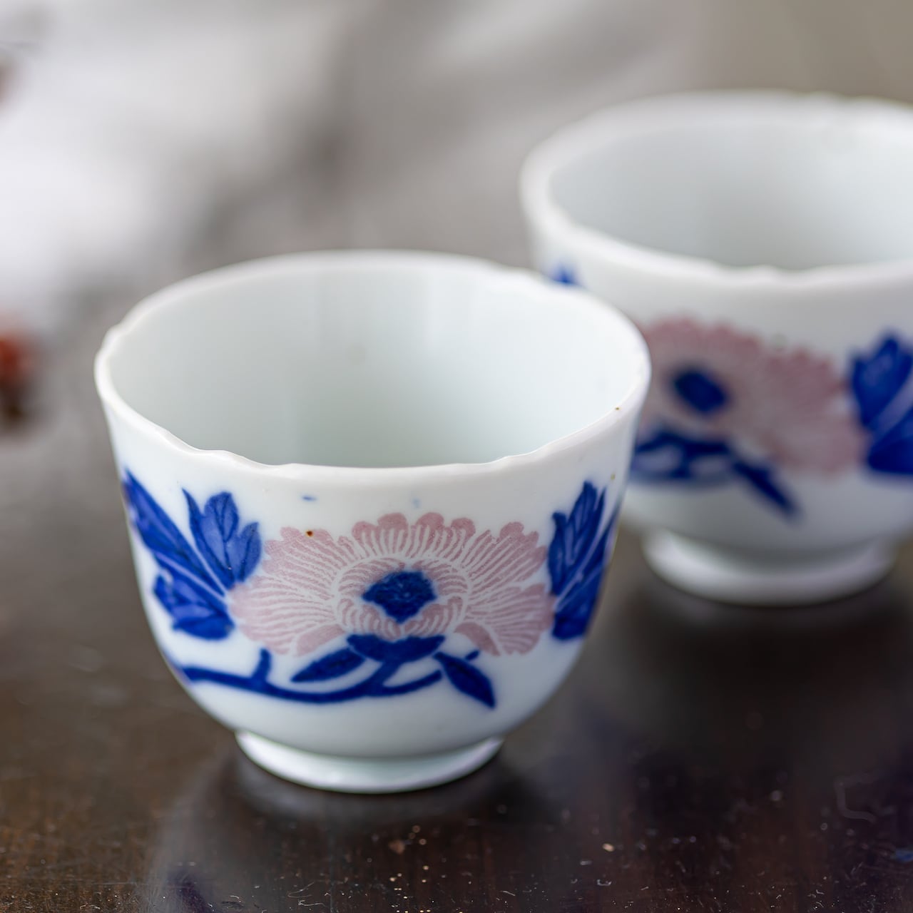 大輪の牡丹の花を一 輪絵付けした素朴な器です。そば猪口にも湯呑みにも、普段使いに気軽にお使いください。明治・出石