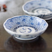 江戸後期から明治初期ごろ。古伊万里の代表的な絵柄、塵唐草模様の豆皿。見込みには松竹梅が描かれています。