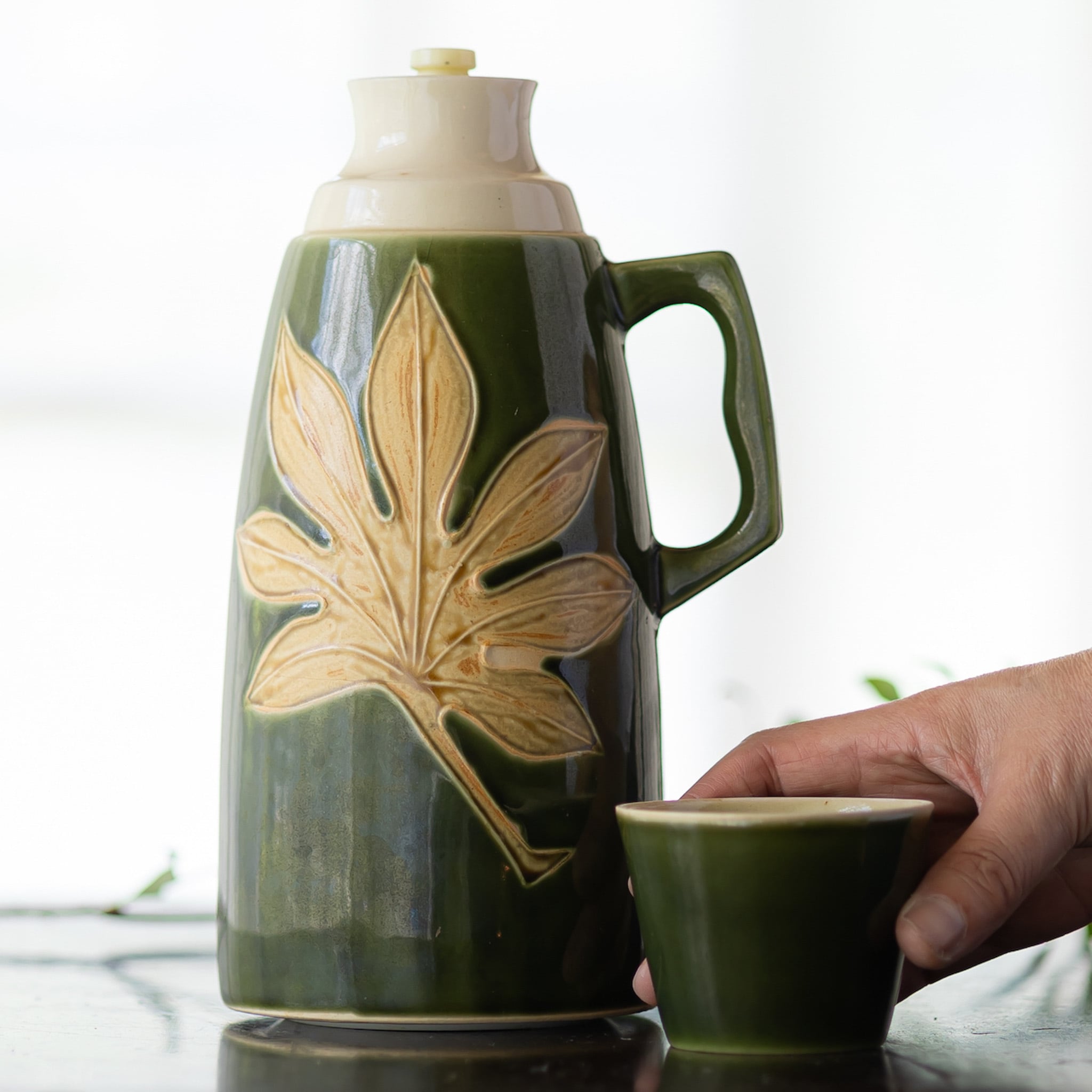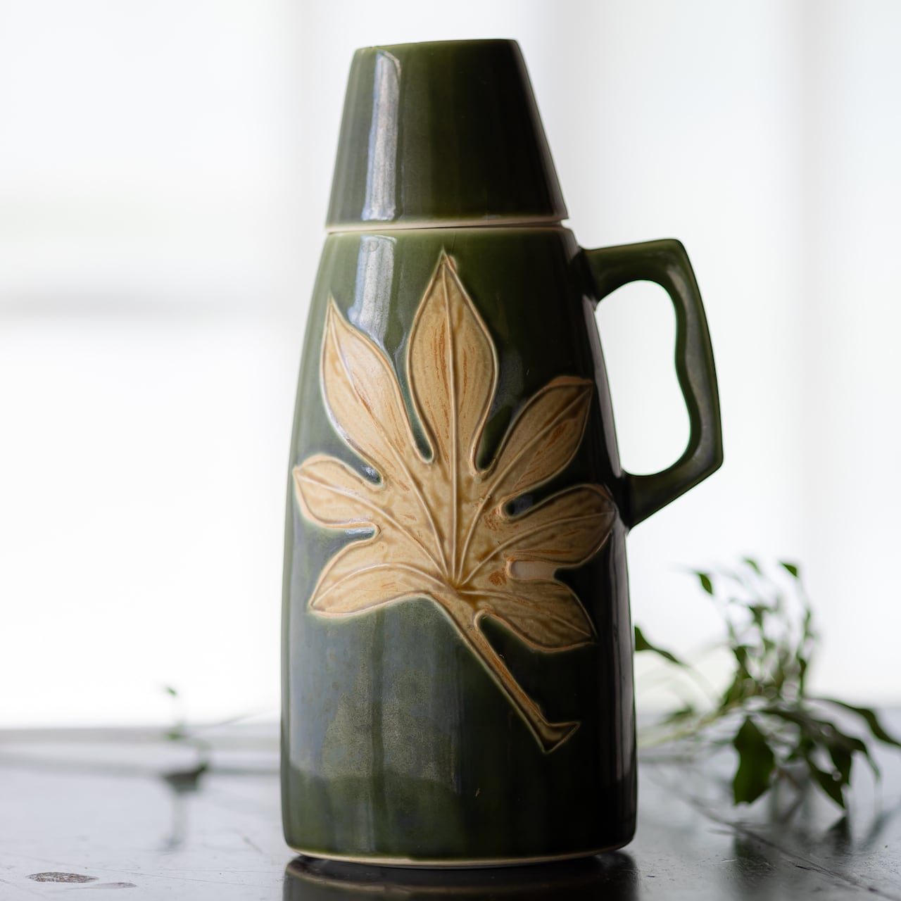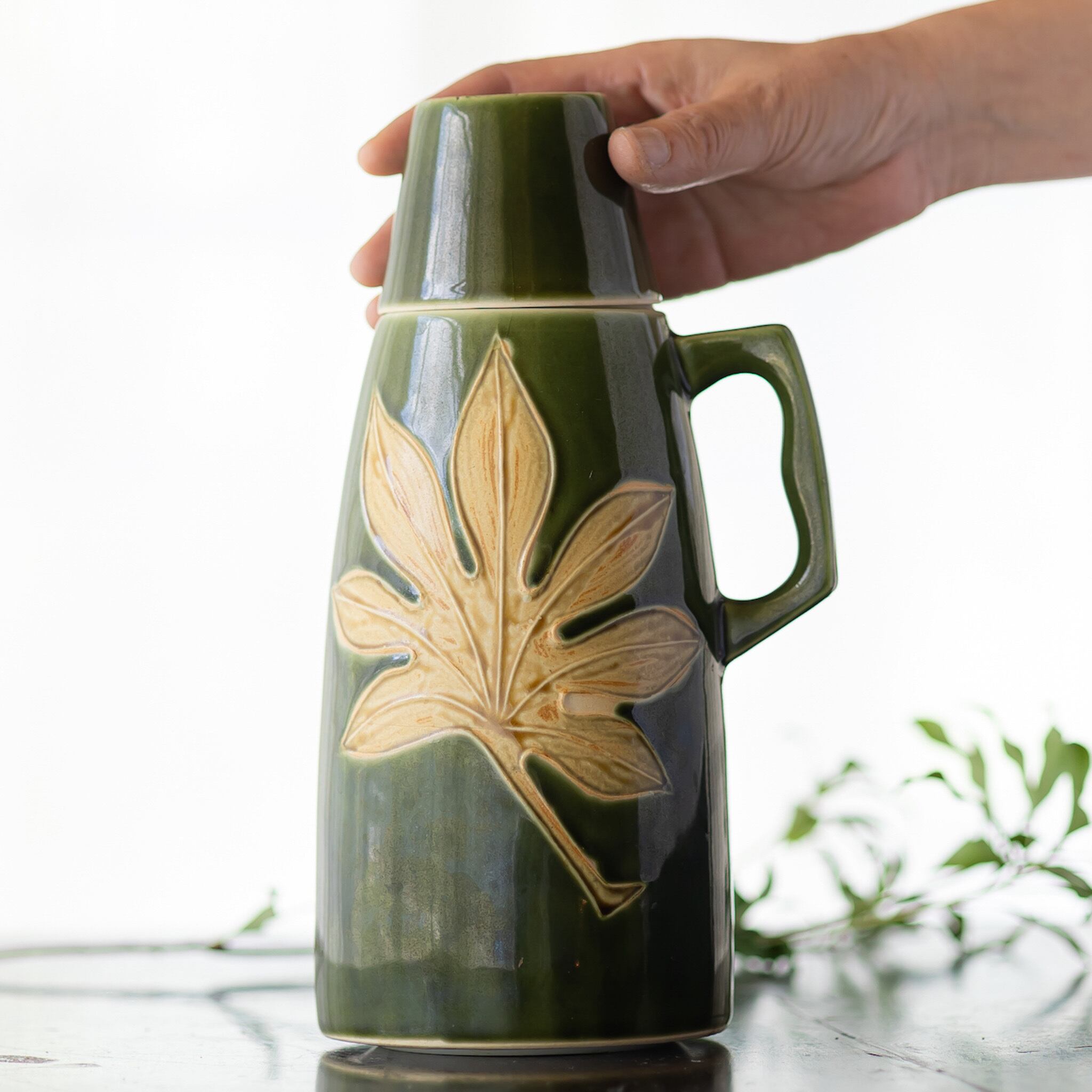 清水焼の陶器製魔法瓶です。落ち着いたオリーブグリーン地に八つ手の葉が大胆に配置されたデザインが目をひきます。コップがついているところが水筒っぽくてかわいいです。陶泉窯 日陶産業株式会社製。