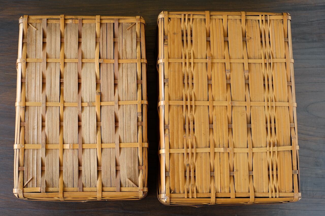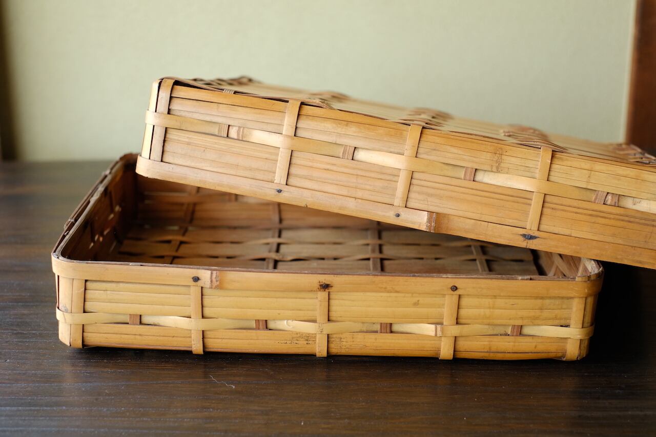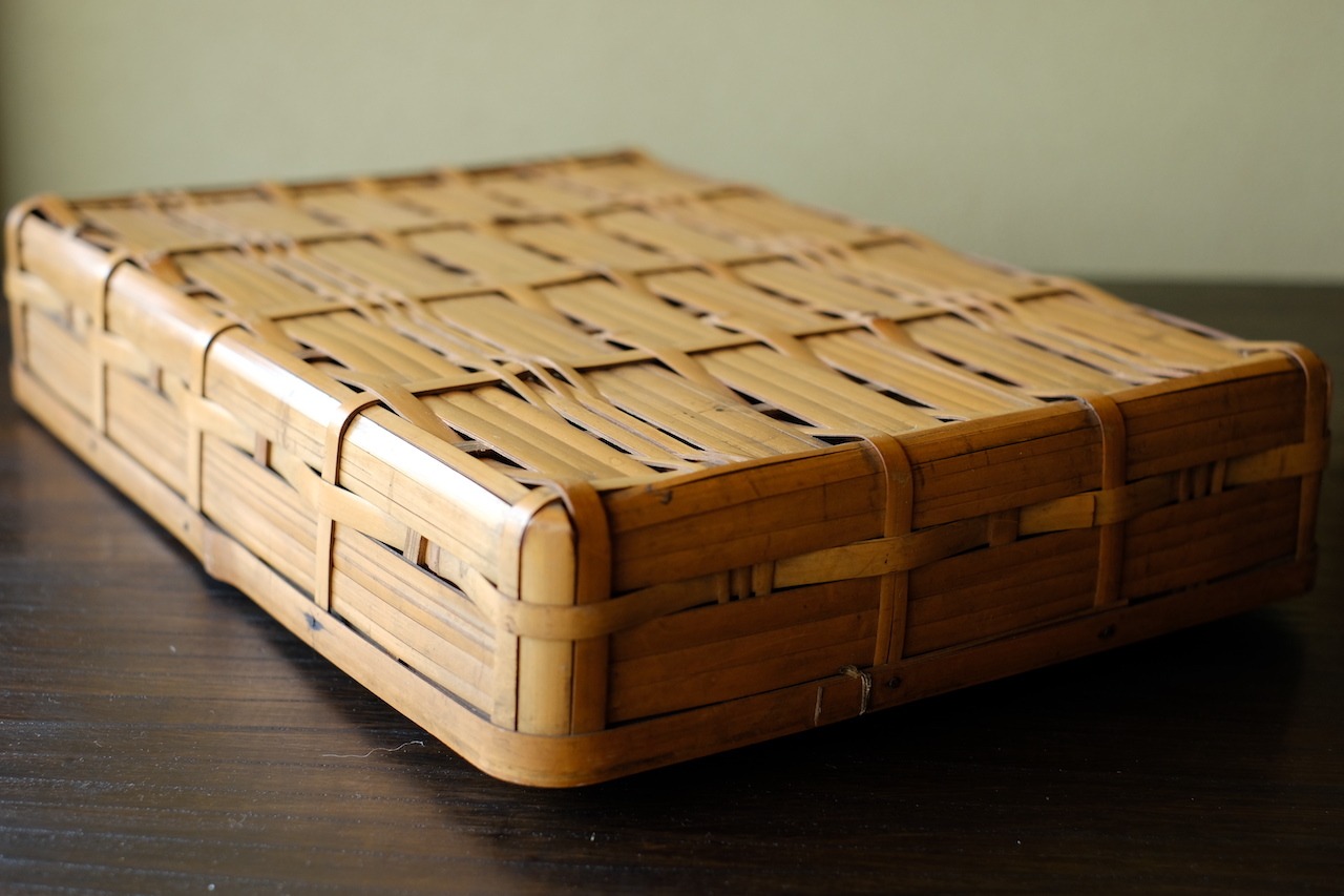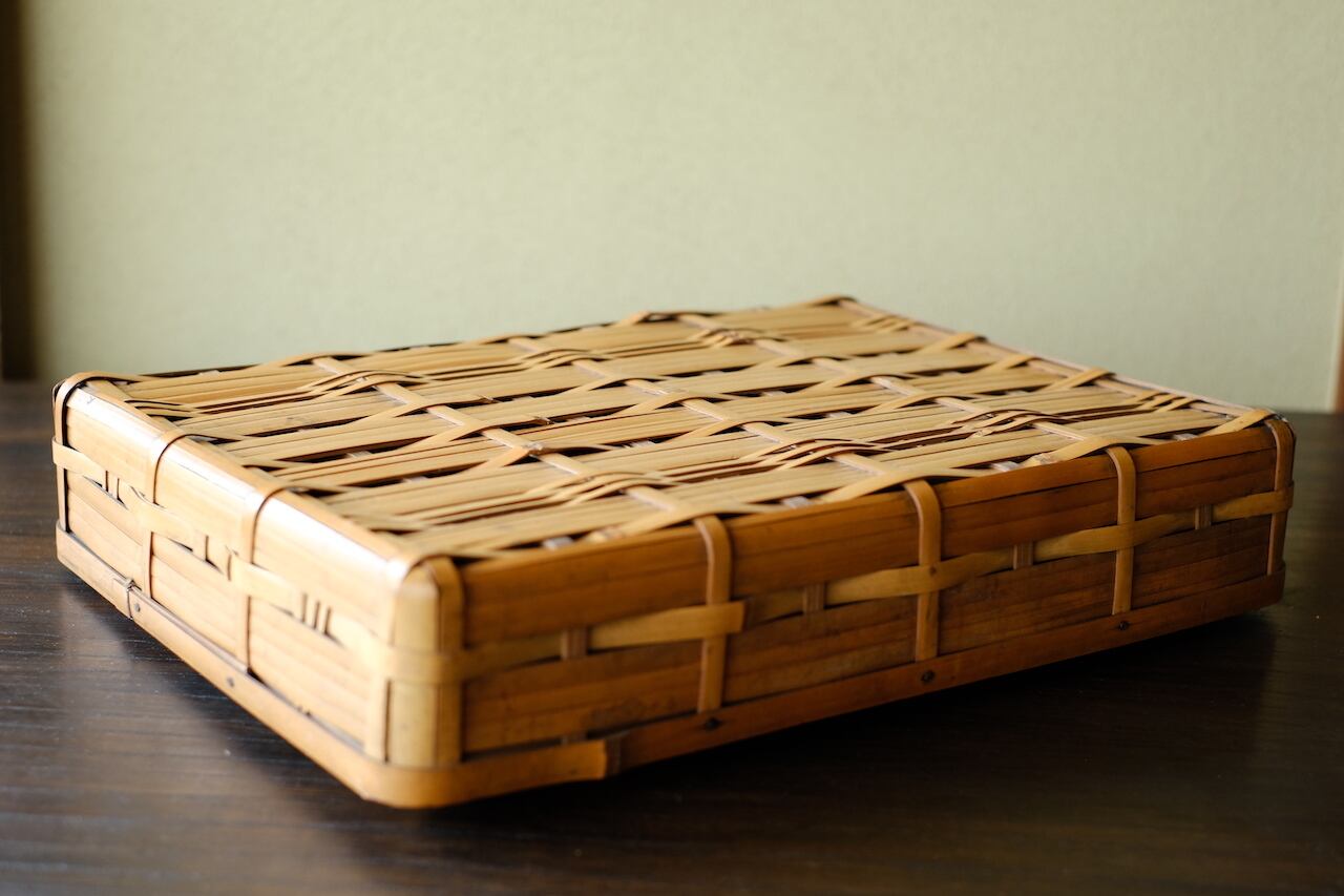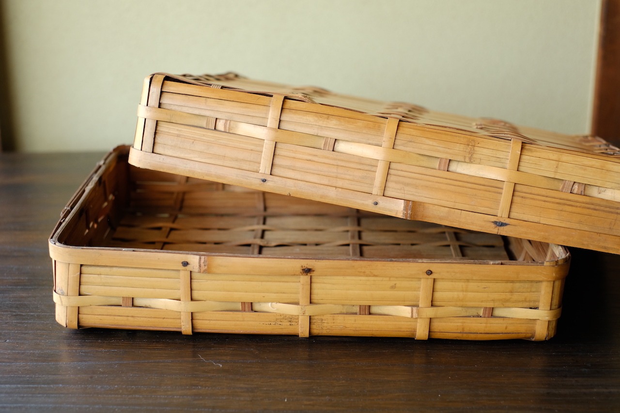 明るく、きれいな色目の竹編み、蓋付きのスクエア箱。意外と見かけないタイプだと思います。ややハードな質感で全体にしっかりした質感です。デスクの上や棚でちょっとした書類などを収納しておくのにも絵になりつつ重宝しそうです。