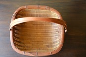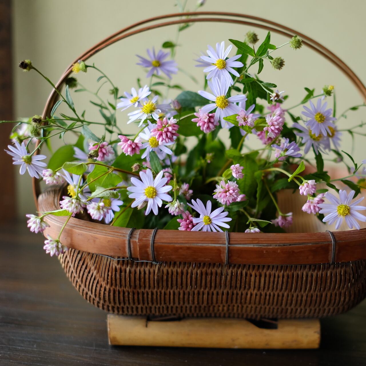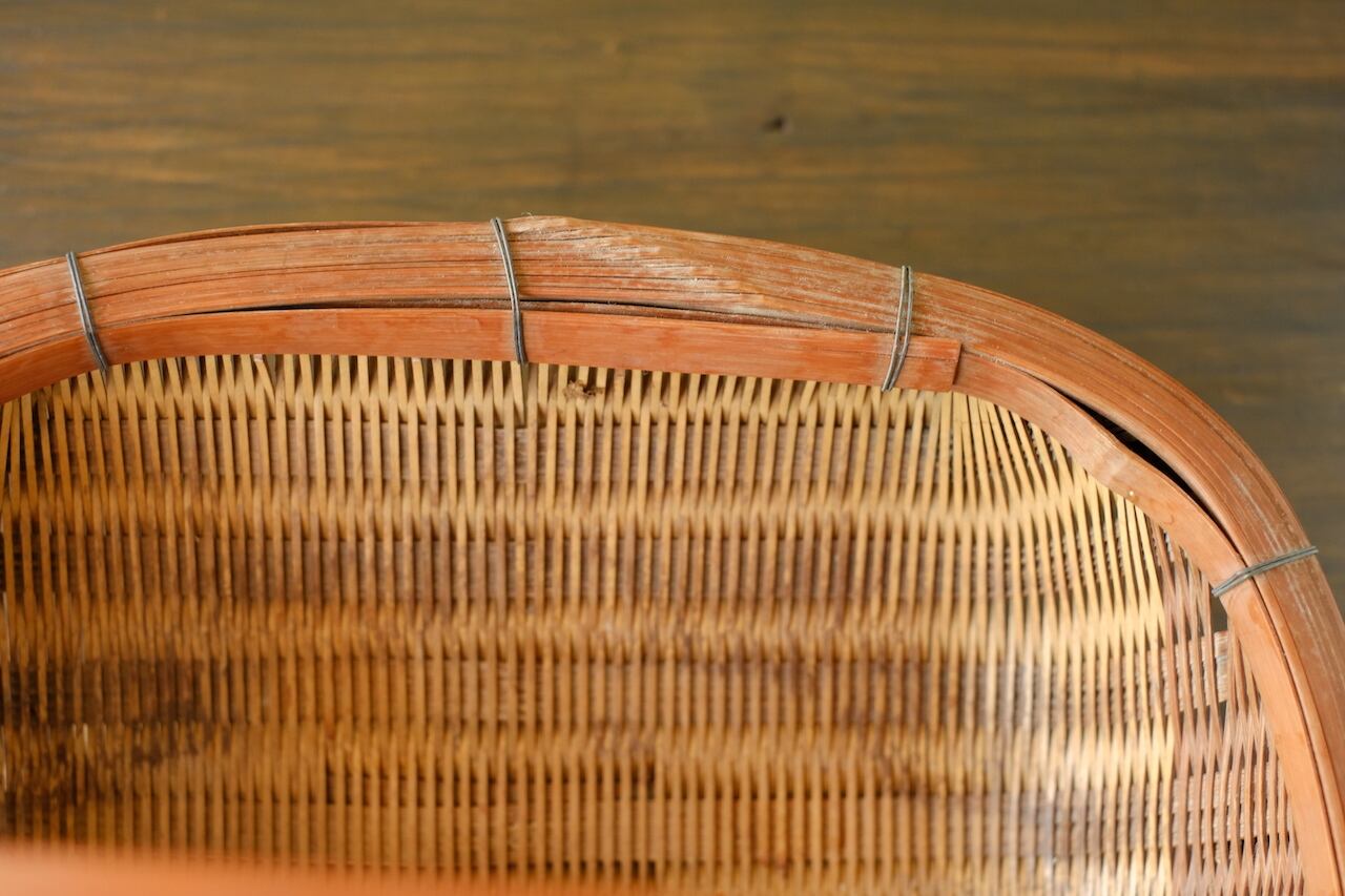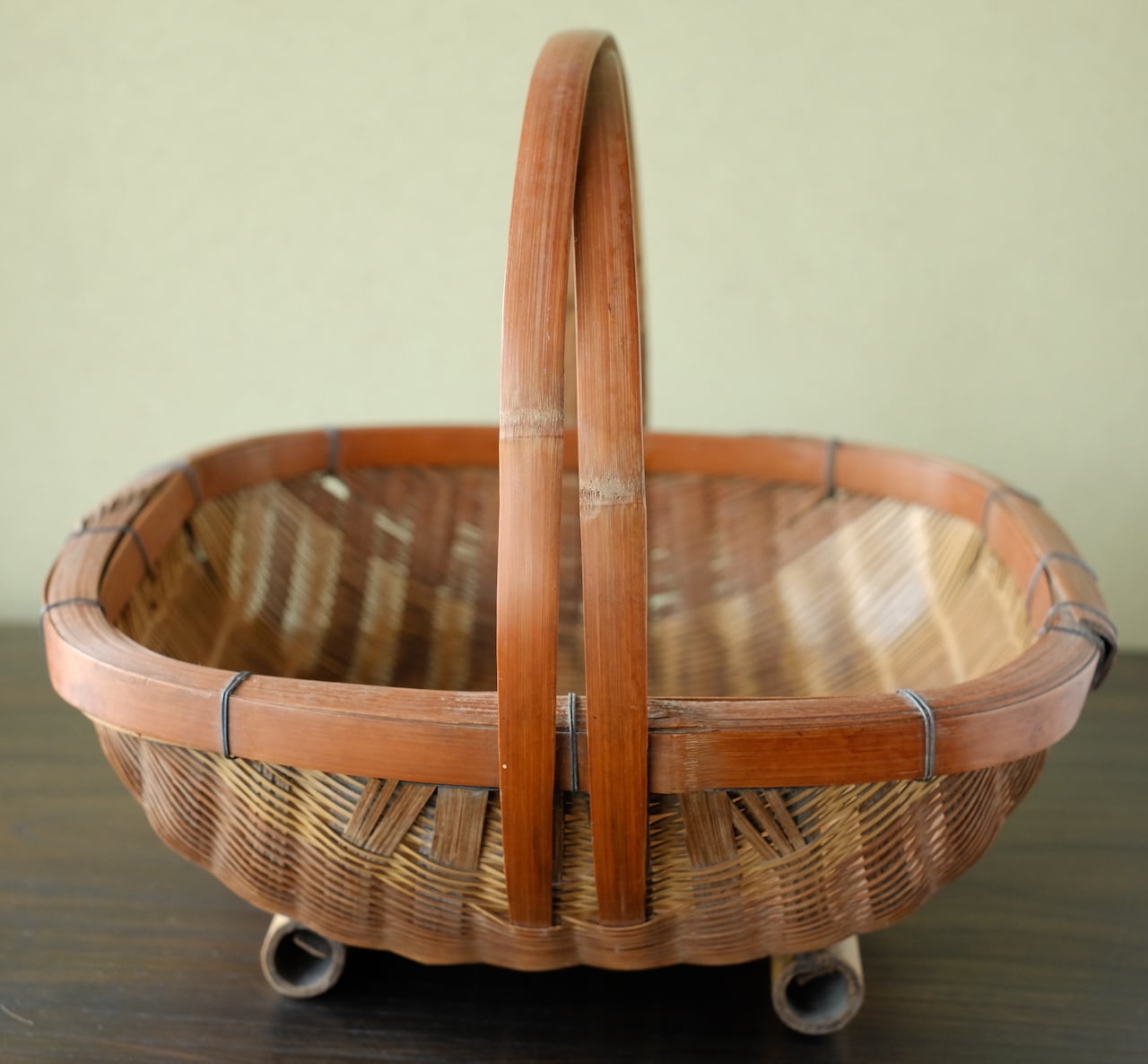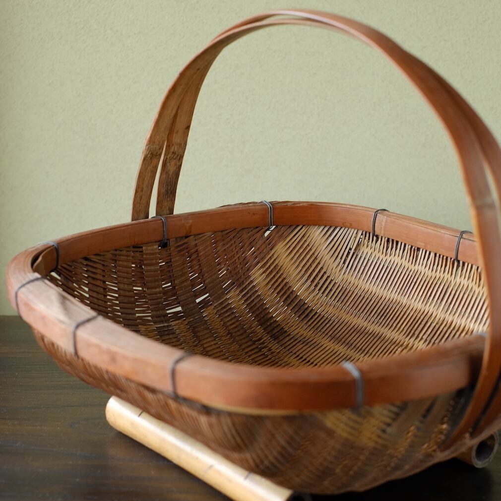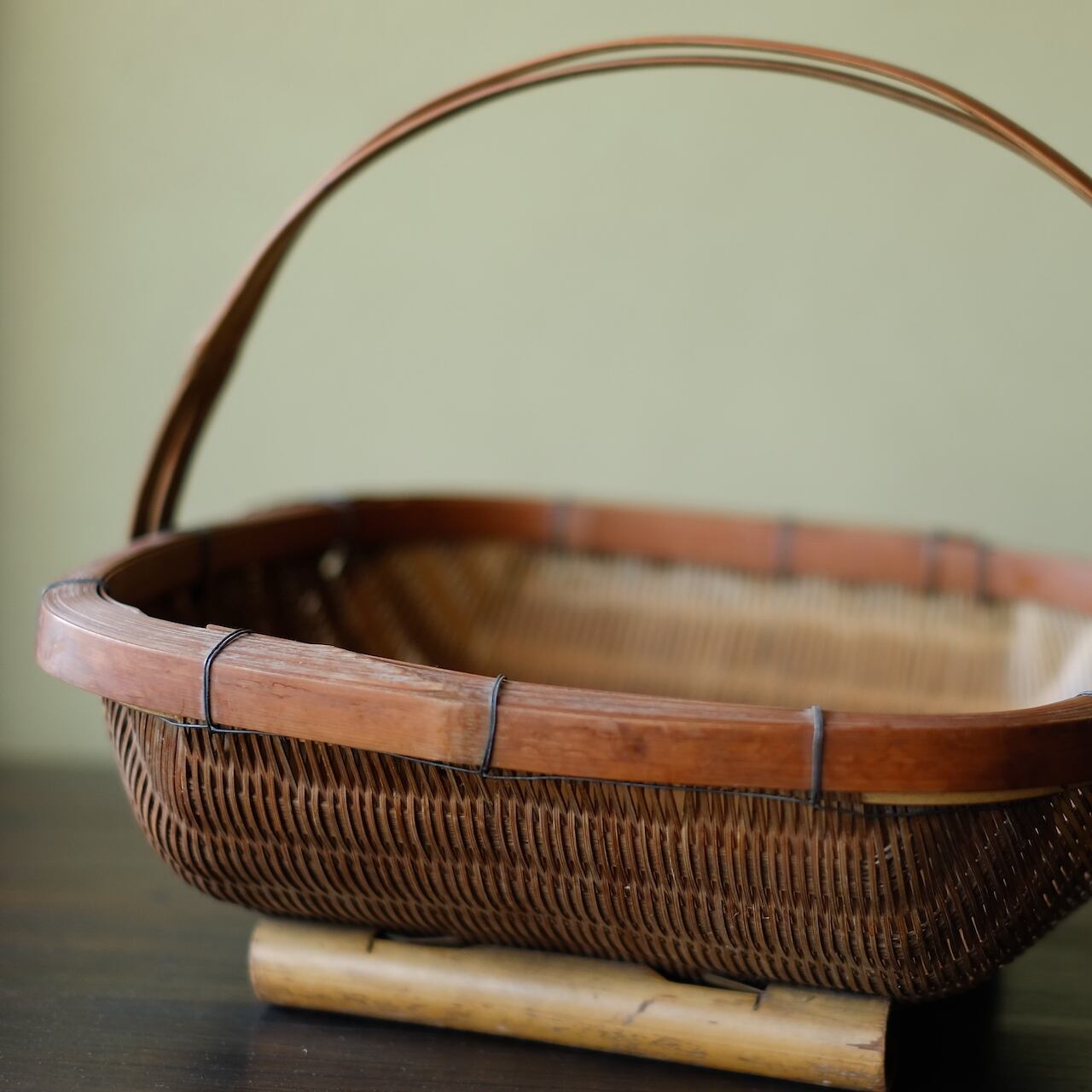 全体の経年の色合いや、持ち手や足の竹の風合いがとてもいい雰囲気になっています。ちょっとした整理かごや、ドライフラワーを入れたり、落としを入れて花を生けても風情があり、工夫して色々楽しめそうです。