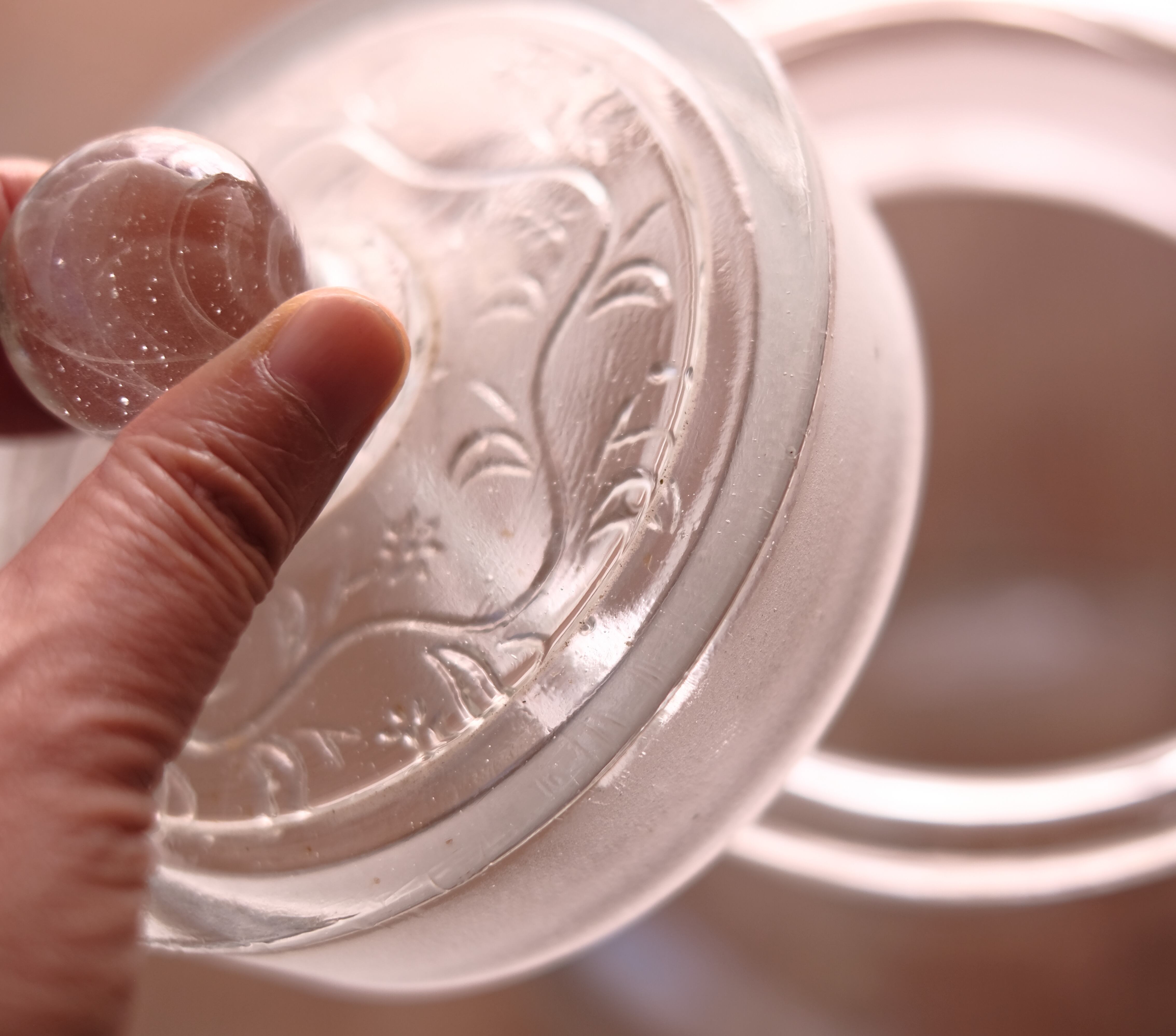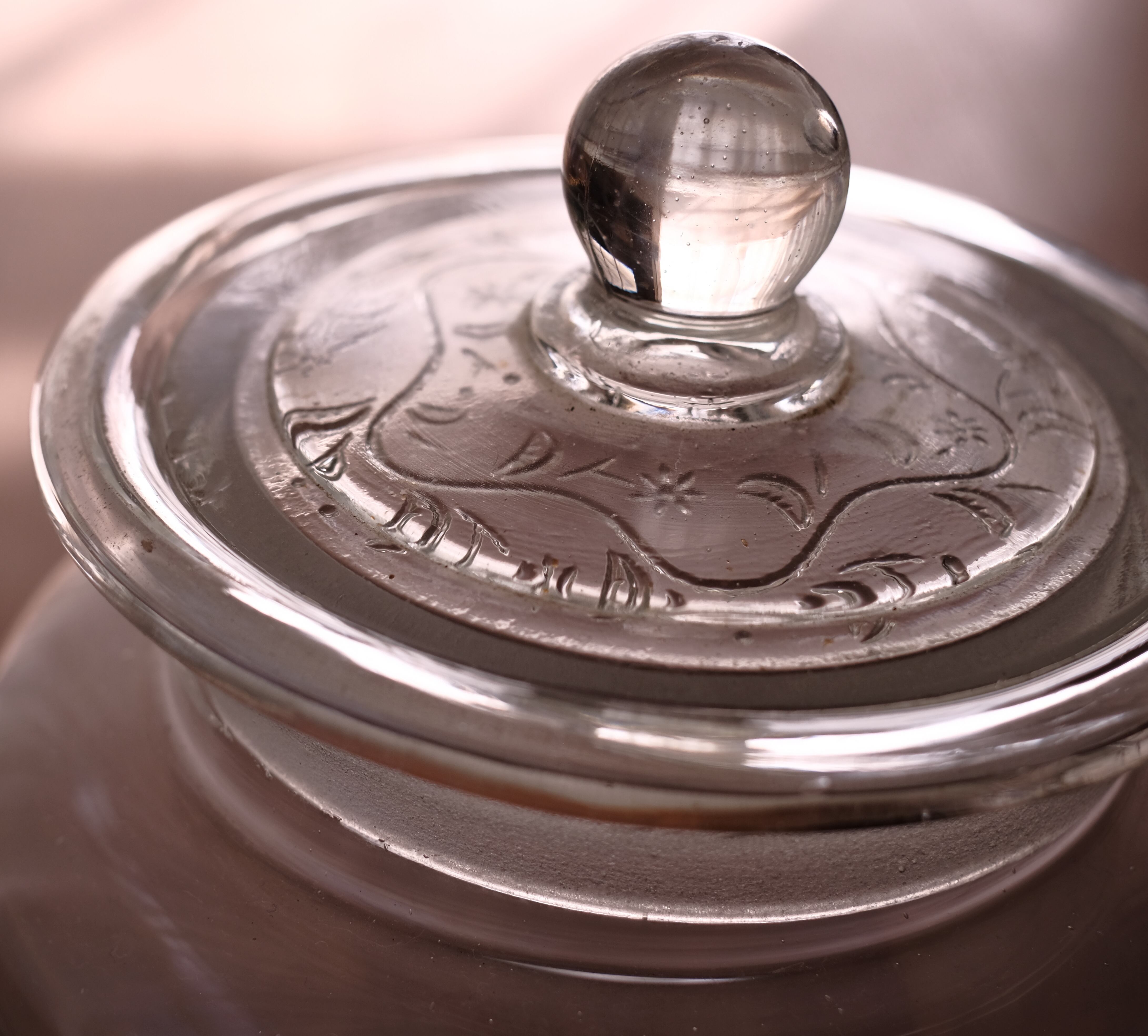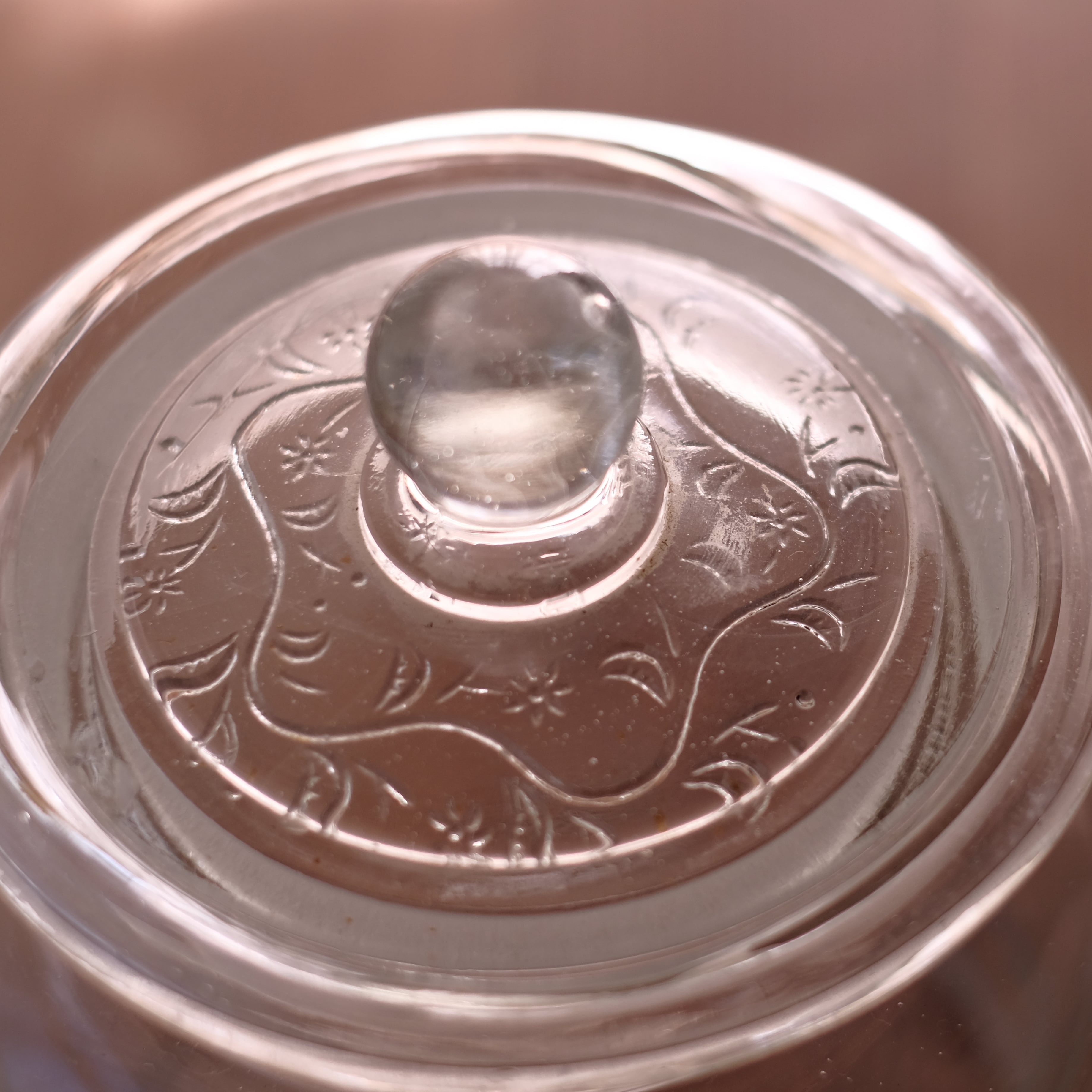 蓋の草花模様が可愛いガラス瓶。吹きガラス特有の揺らぎや気泡が味わい深いです。好きなものを入れてガラスショーケースみたいにしたり、何を入れても(入れなくても)雰囲気を作ってくれます。